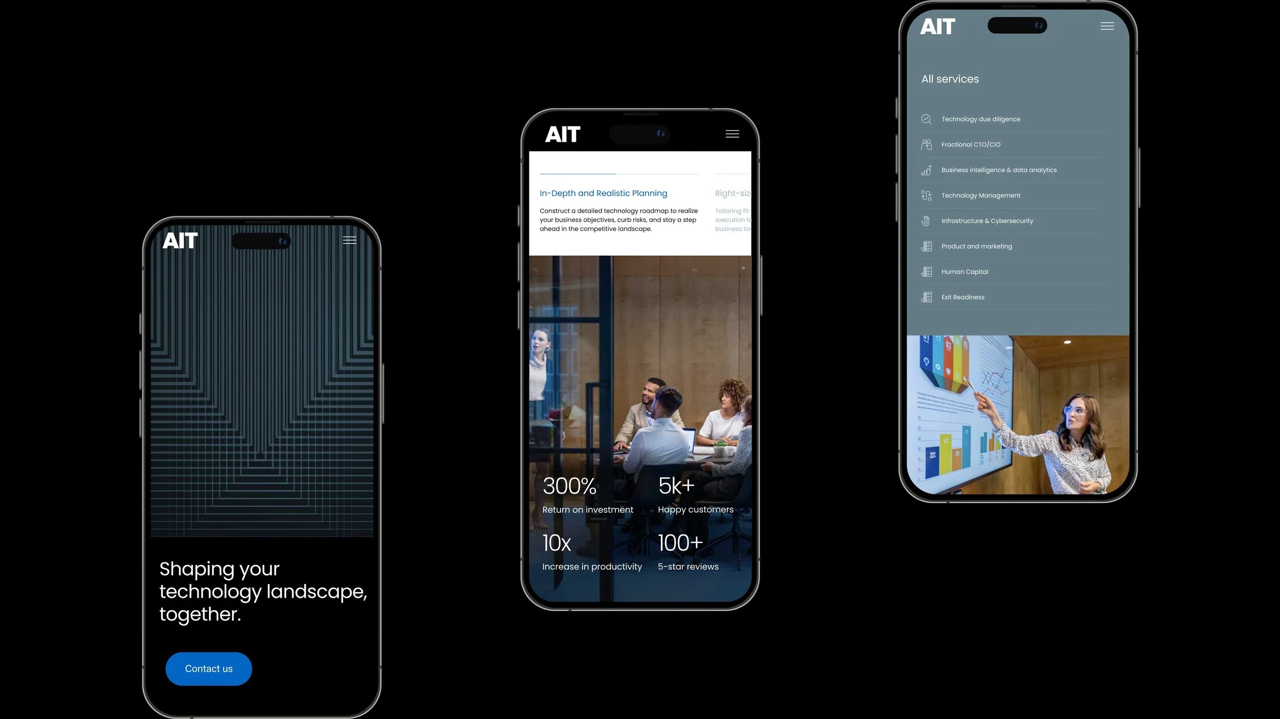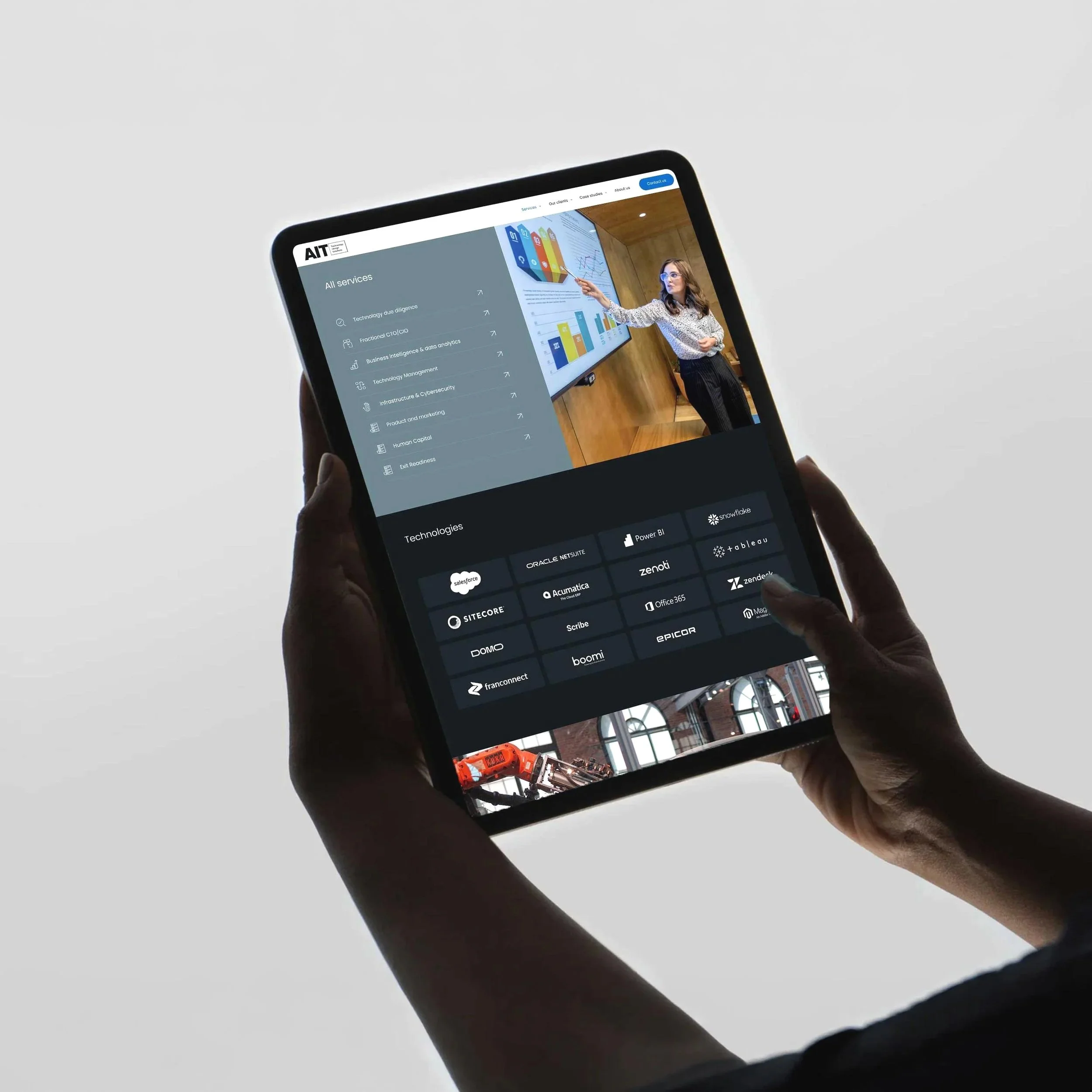 AIT has spent over two decades helping enterprises navigate complex technology and management challenges — but the brand hadn't kept pace with that track record. The redesign set out to close that gap: a new visual identity, art direction, and presentation system that reflects the depth, confidence, and precision of a firm operating at this level.