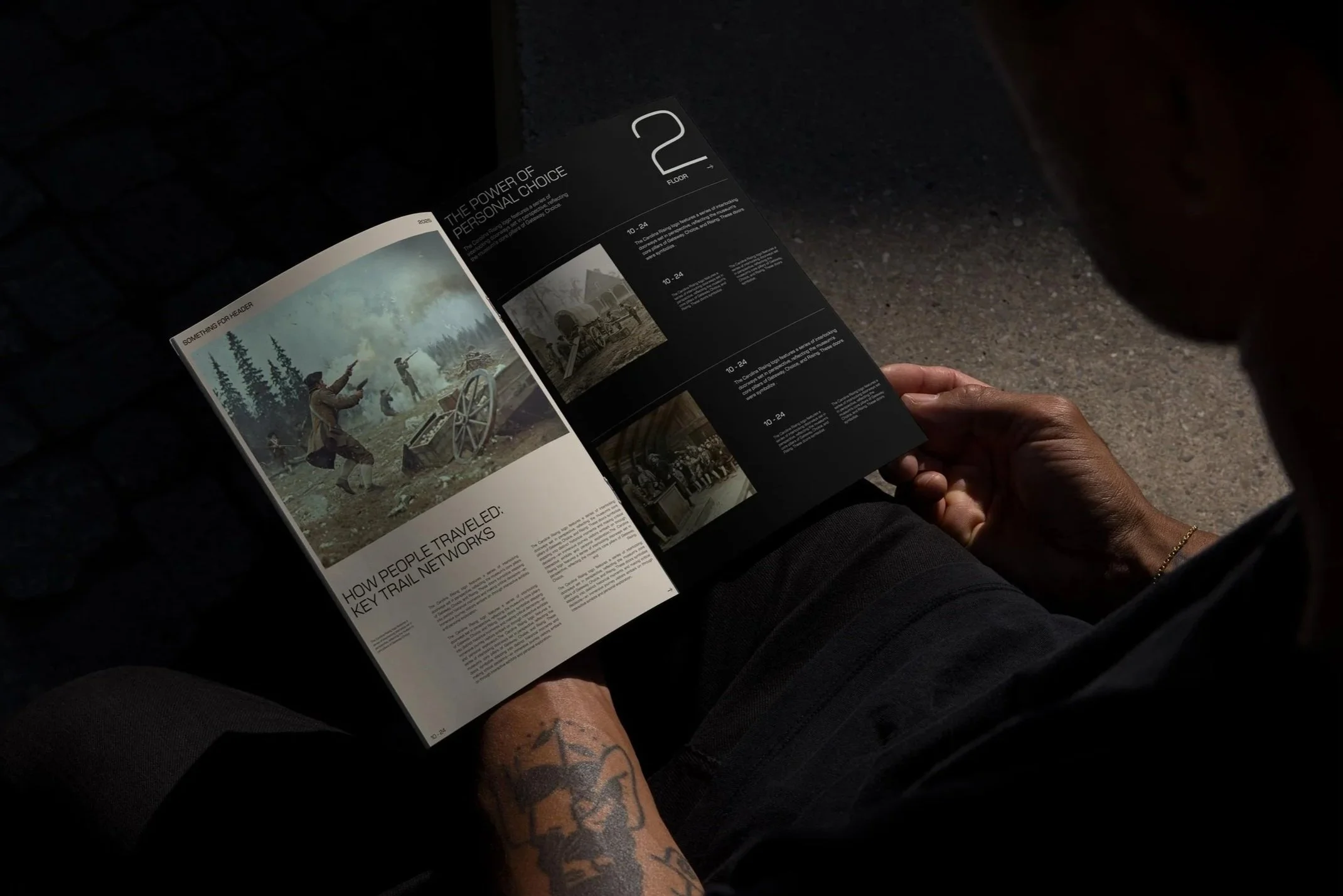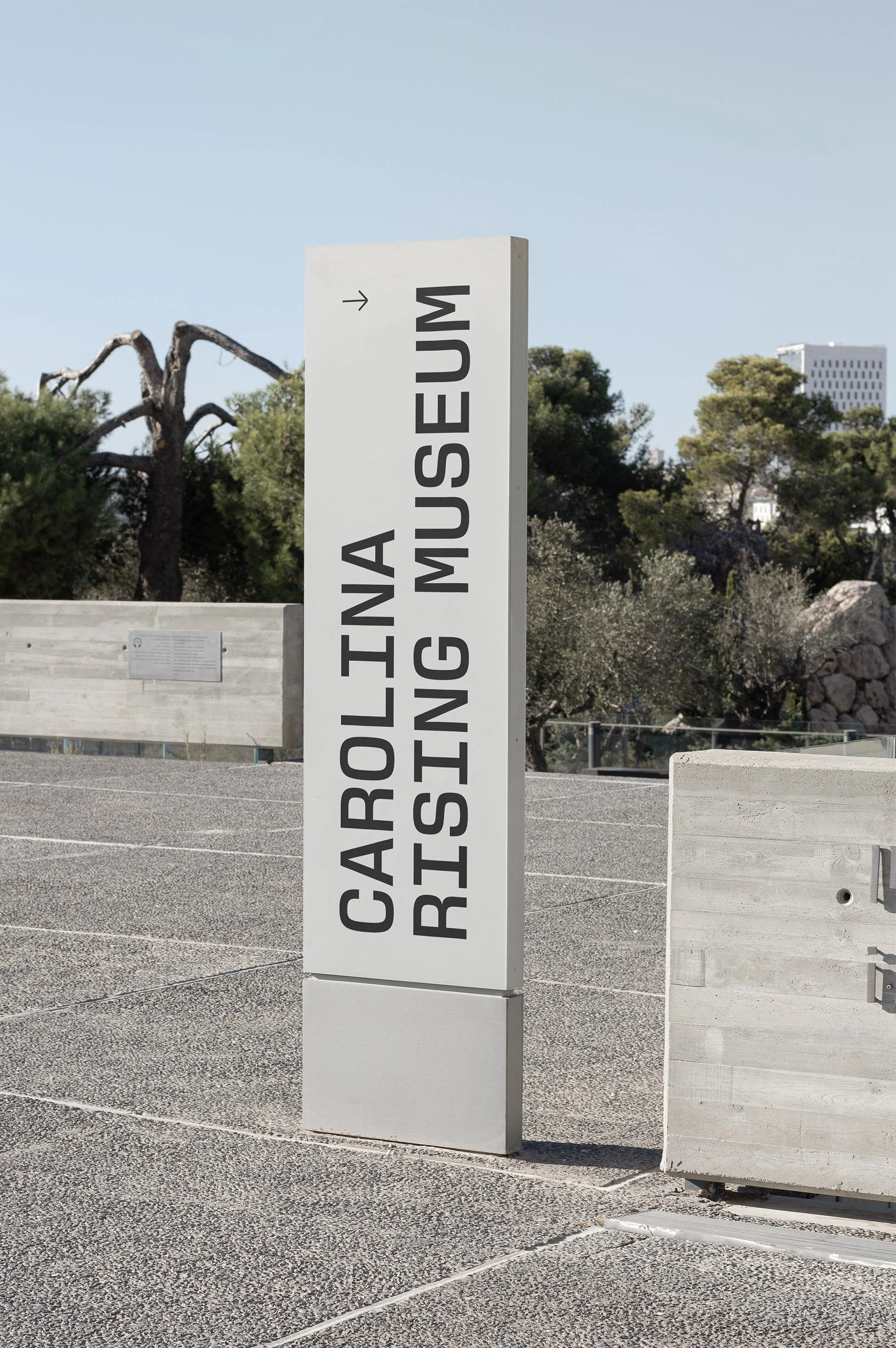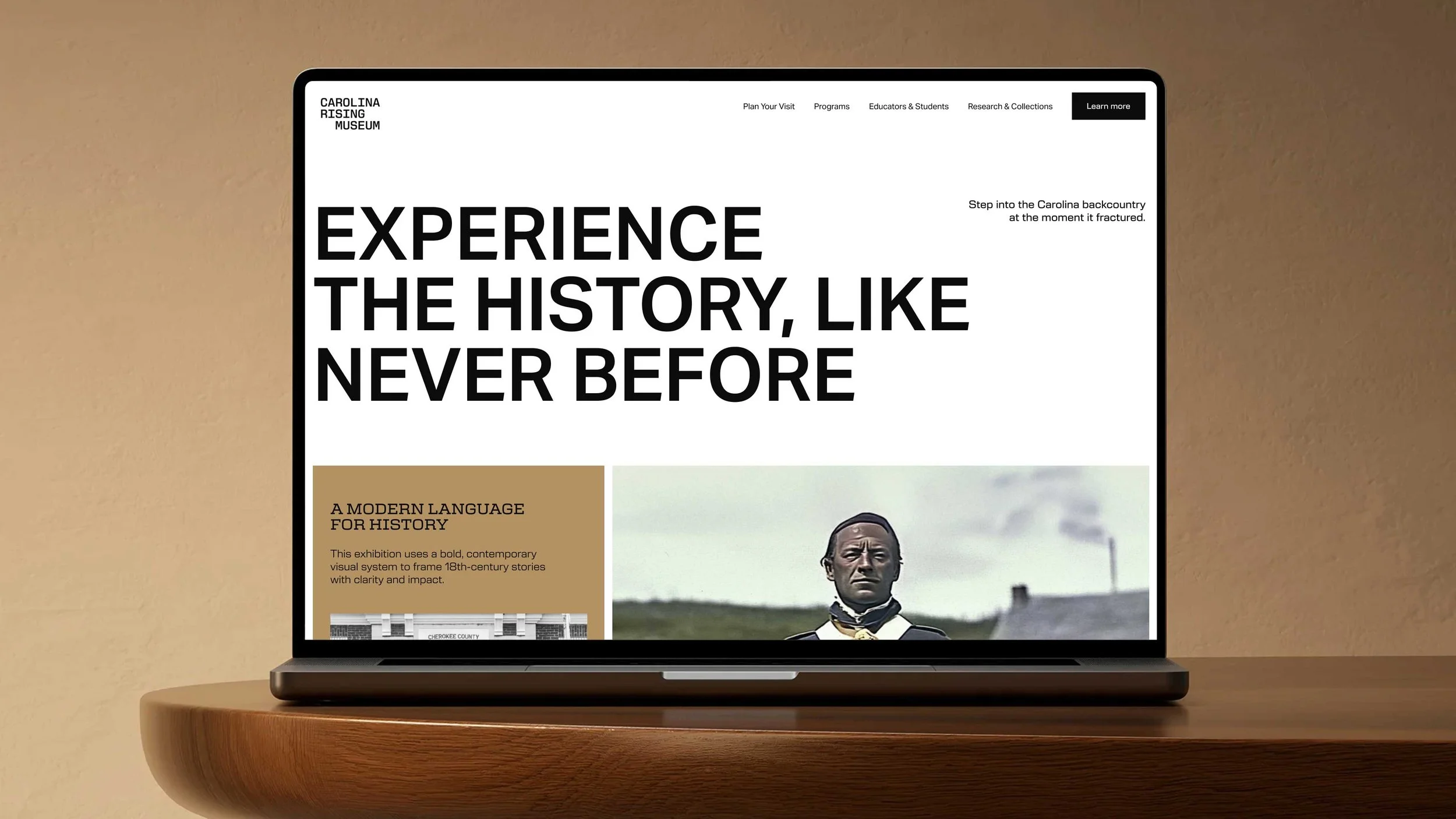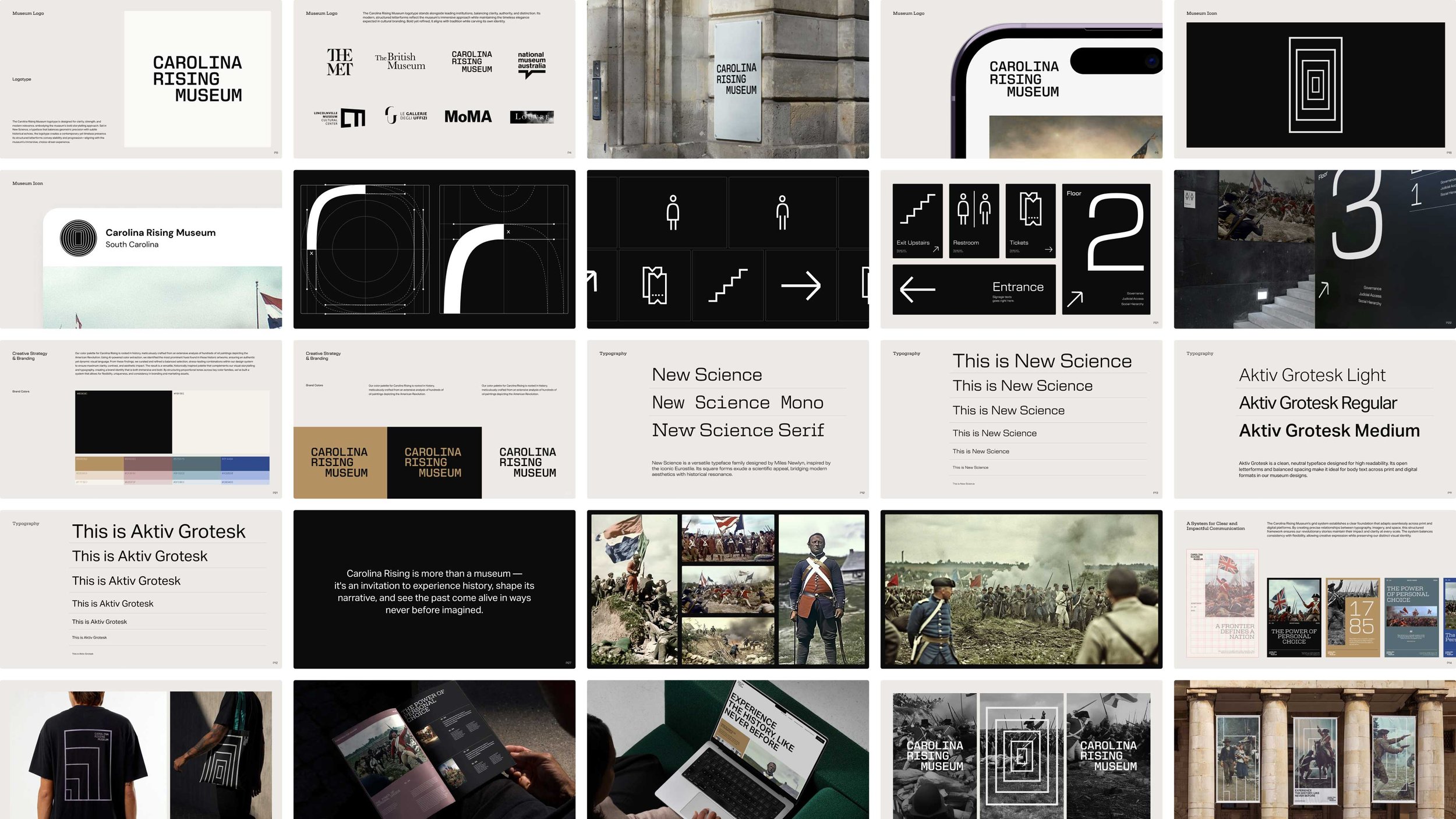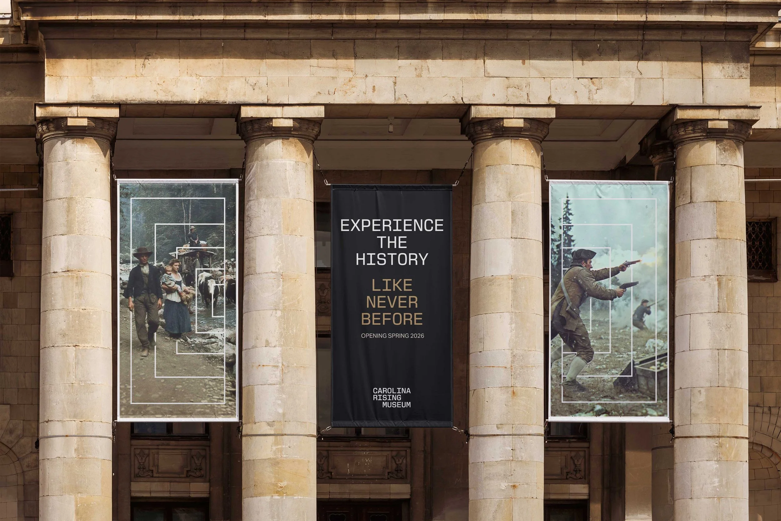 The Carolina Rising logotype merges past and present through New Science typeface—a deliberate choice that brings modern clarity to Revolutionary-era storytelling. The custom gateway symbol acts as a visual threshold, inviting visitors to step across centuries and experience history as an immersive journey rather than a static exhibit.