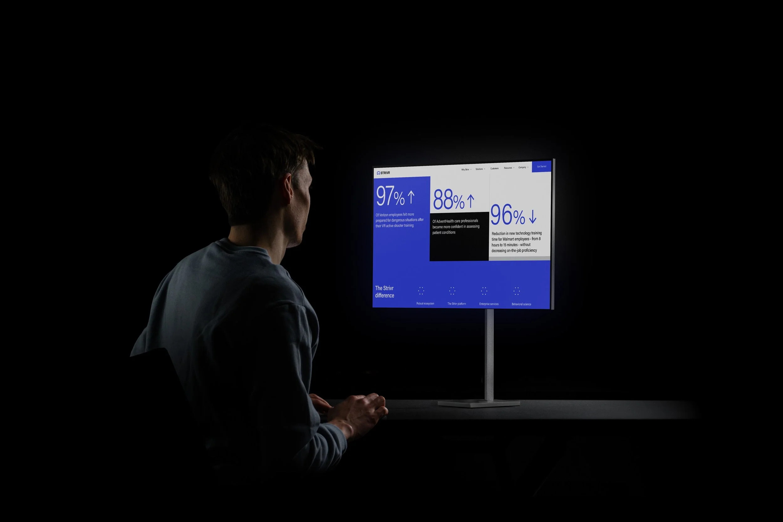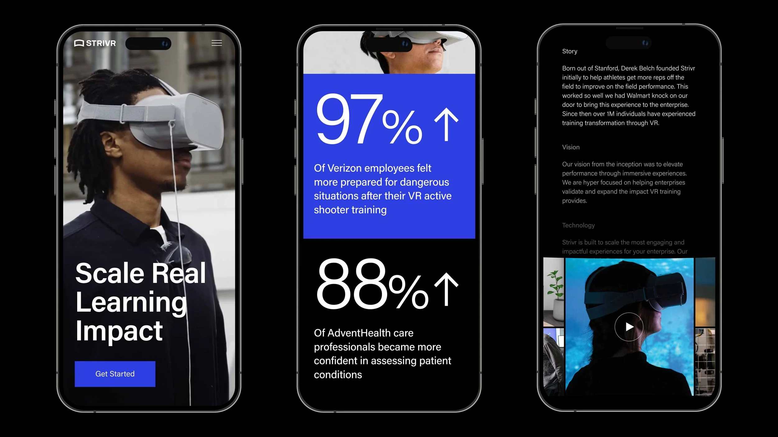 Strivr sits at the frontier of enterprise VR training, trusted by Walmart, Verizon, and Bank of America to reshape how workforces learn at scale. The brand, however, hadn't kept pace with the product. A visual refresh and website redesign brought Strivr's identity in line with the ambition of what it actually does: a cohesive visual language, sharper art direction, and a UX foundation built to carry the brand forward.