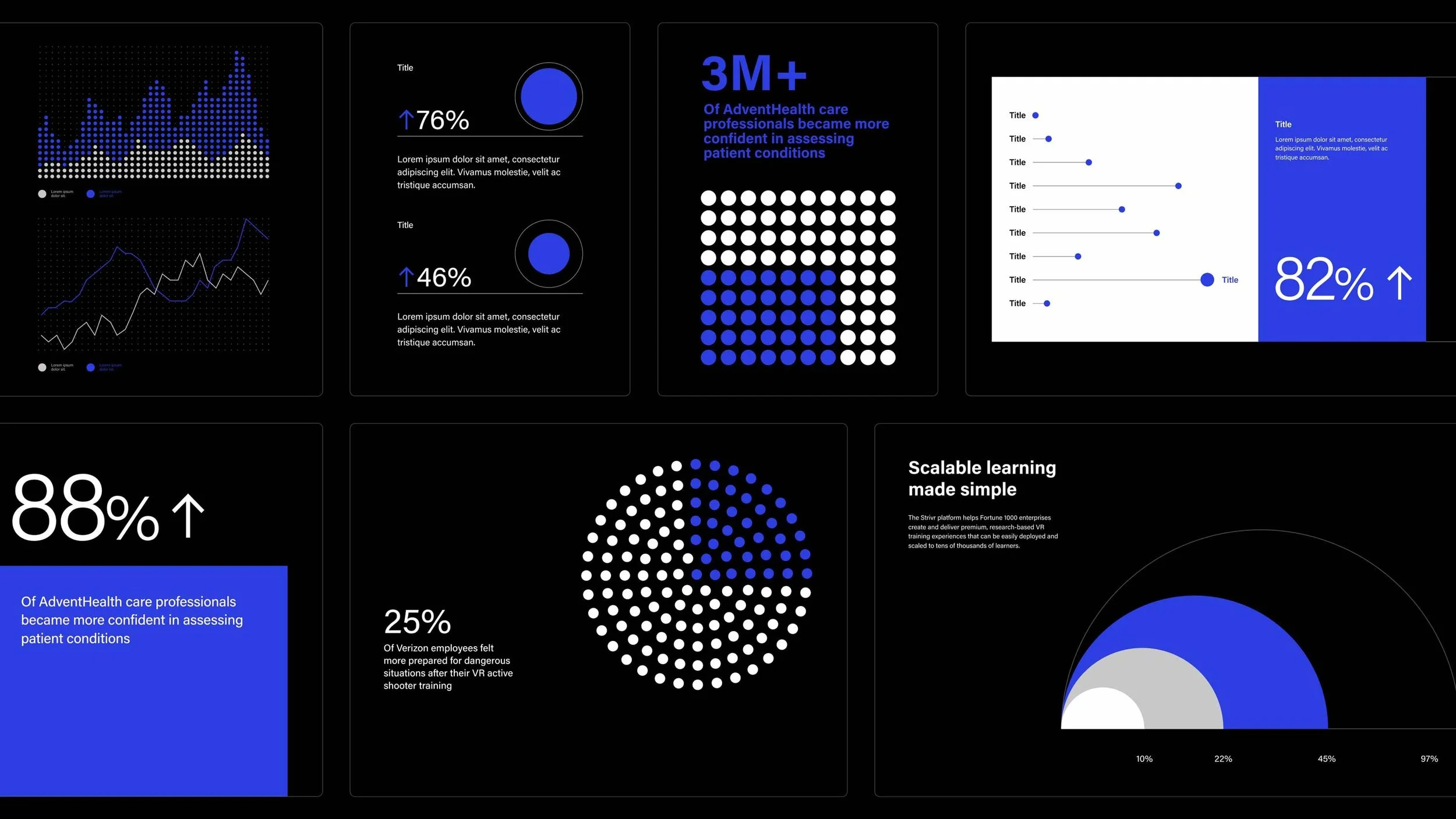 Strivr's business runs on data, so the redesign made it the visual centerpiece. A custom data visualization library turned key metrics into a core part of the brand story, supported by a restructured information hierarchy and modular component system built for clarity and scale.