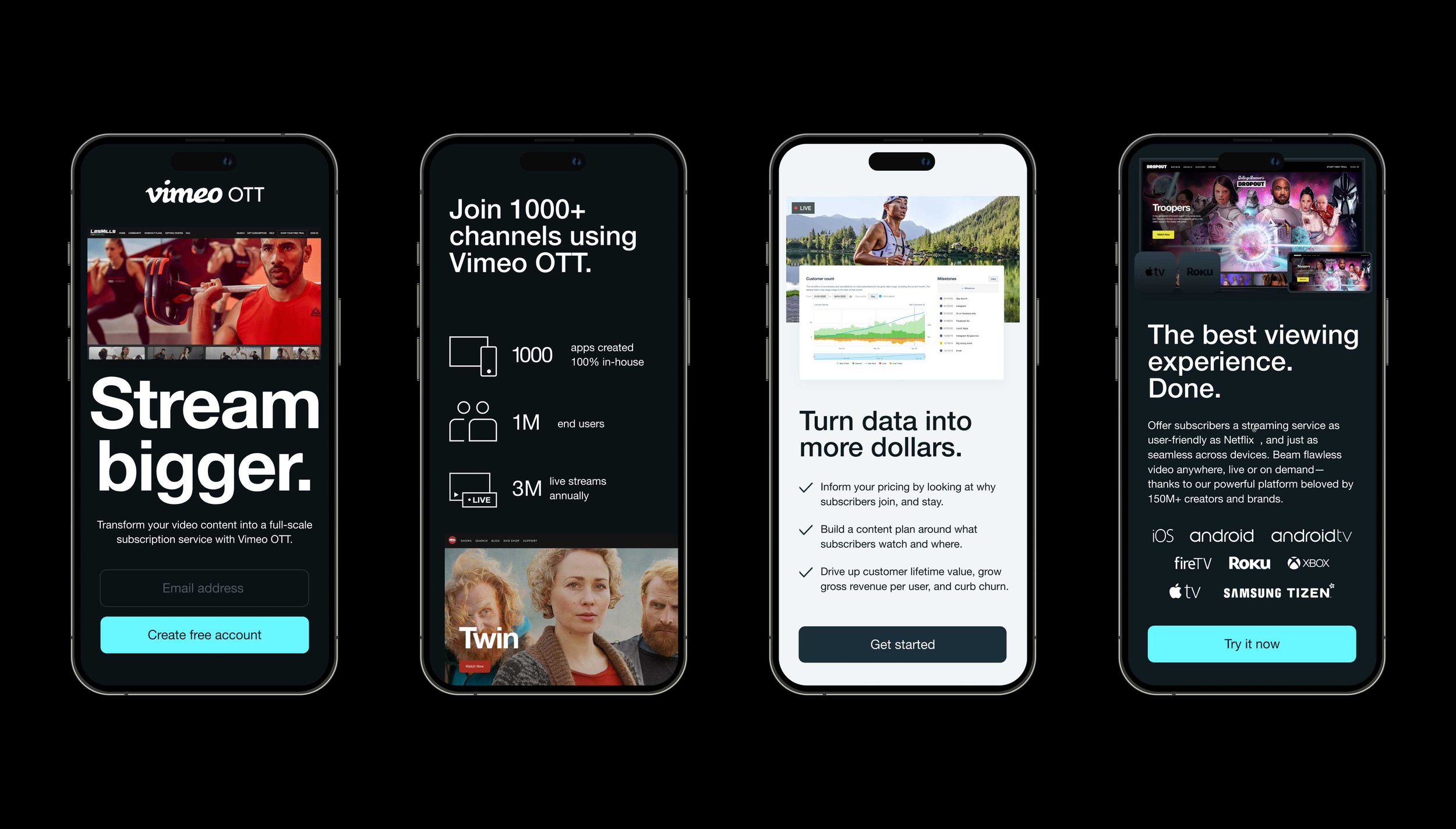 Vimeo OTT gives content creators the infrastructure to launch and monetize their own subscription channels — independent of the platforms that own their audience. The redesign established a visual language to match that ambition: modern, approachable, and confident enough to compete.